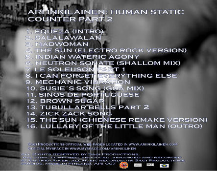 Sagi Productions has produced new album called Ari Inkiläinen: Equeue and the info of its releasing will be released soon. Music videos Equeue, Susie´s Song Part 2 (Bad&Ugly 2010 mix) and Suntan are single song releases from that album. All Rights Reserved by Sagi Productions. All Rights Reserved for the changes by Sagi Productions. | | Send To Friend Human Static Counter Part 2 album coversJuly 28, 2009 by Antti Lehtonen in album.